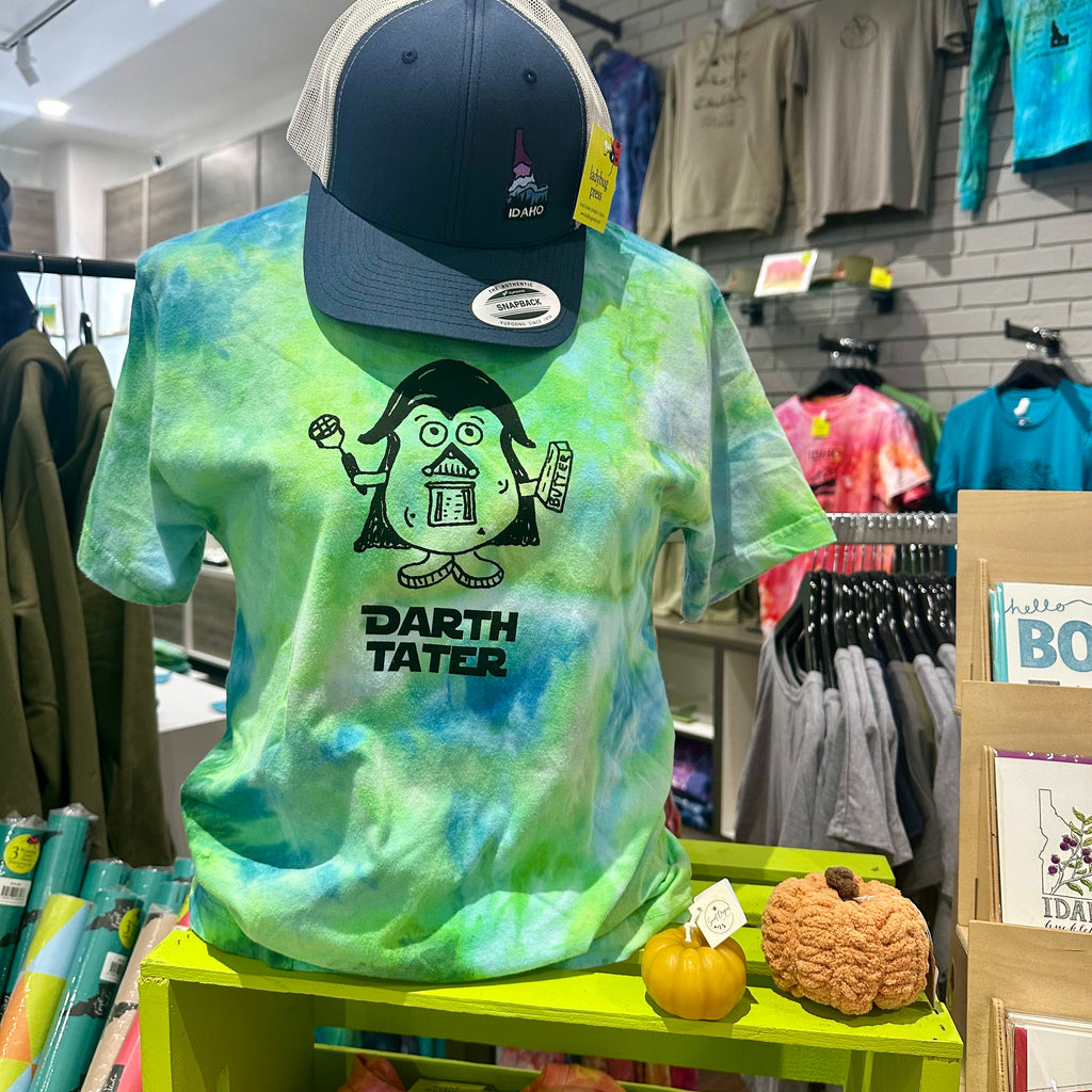 Our Newest Darth Tater illustration hand screen printed on super soft ice dyed t-shirts.
