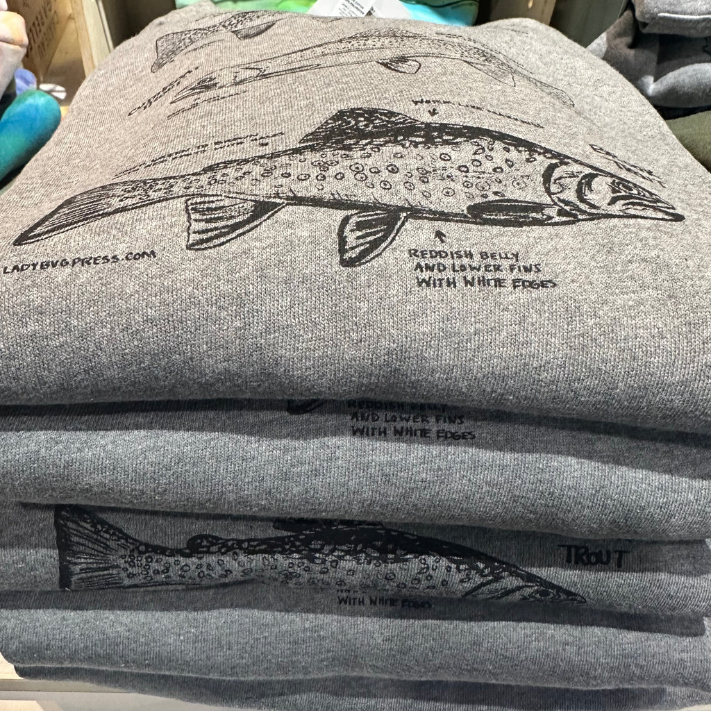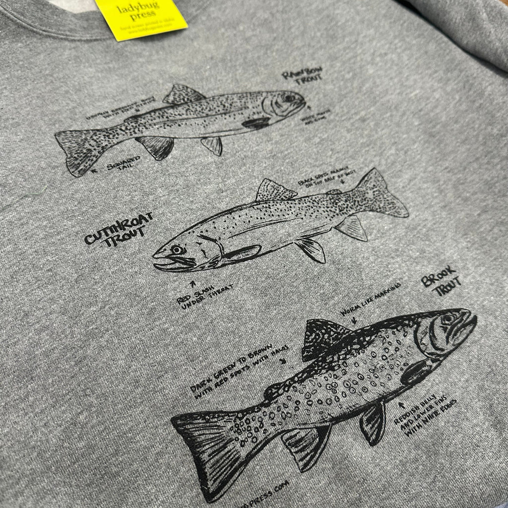 Trout Crewneck Grey Sweatshirt, screen printed with eco-friendly waterbased inks, adult sizes